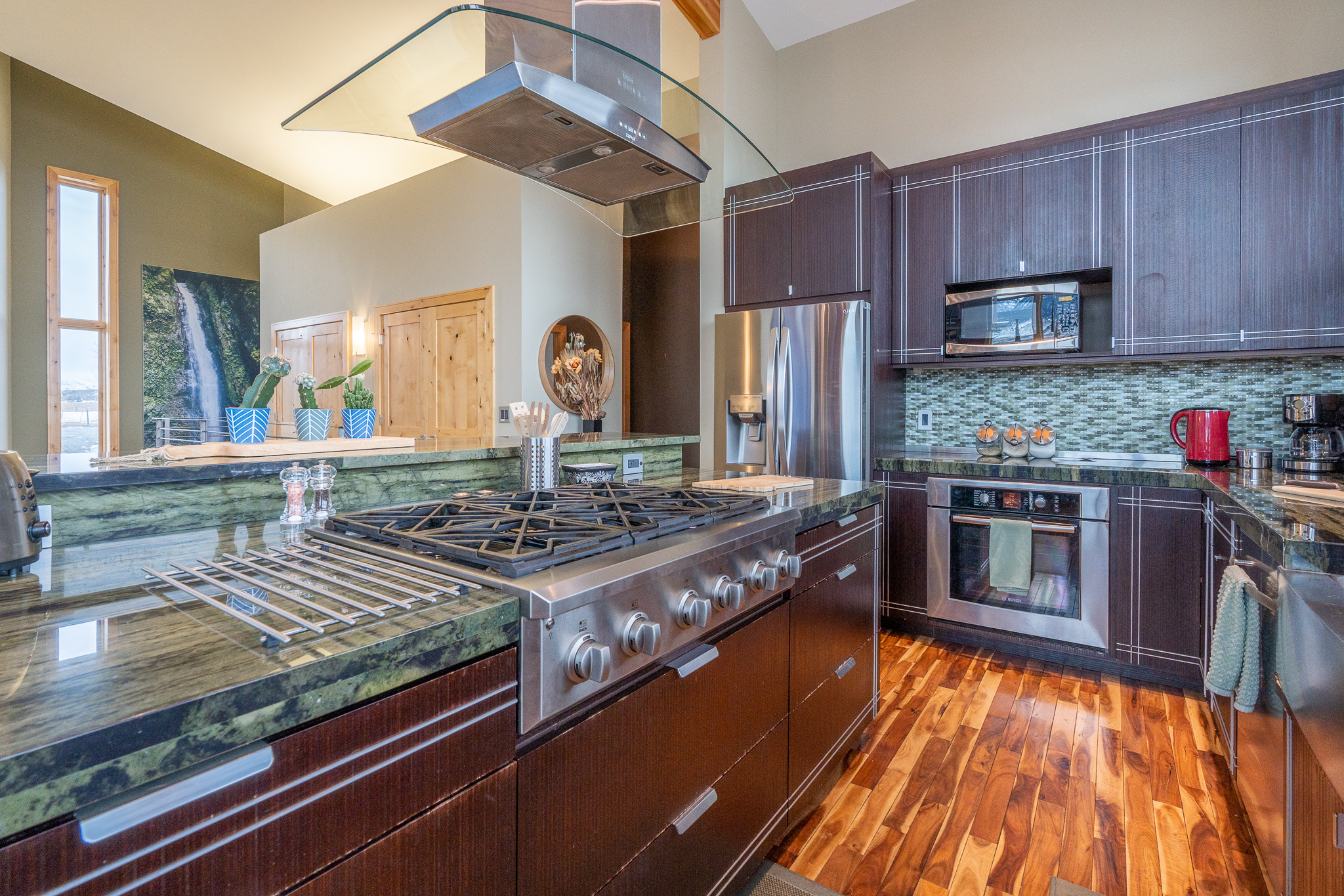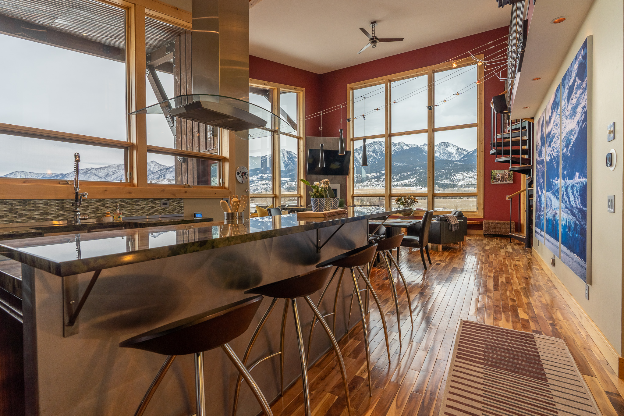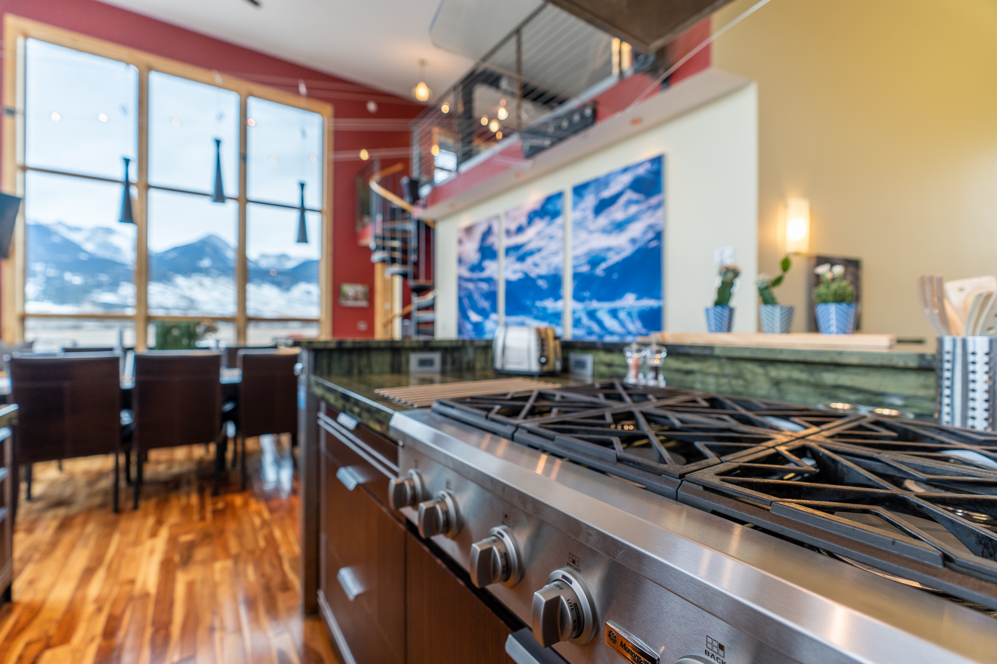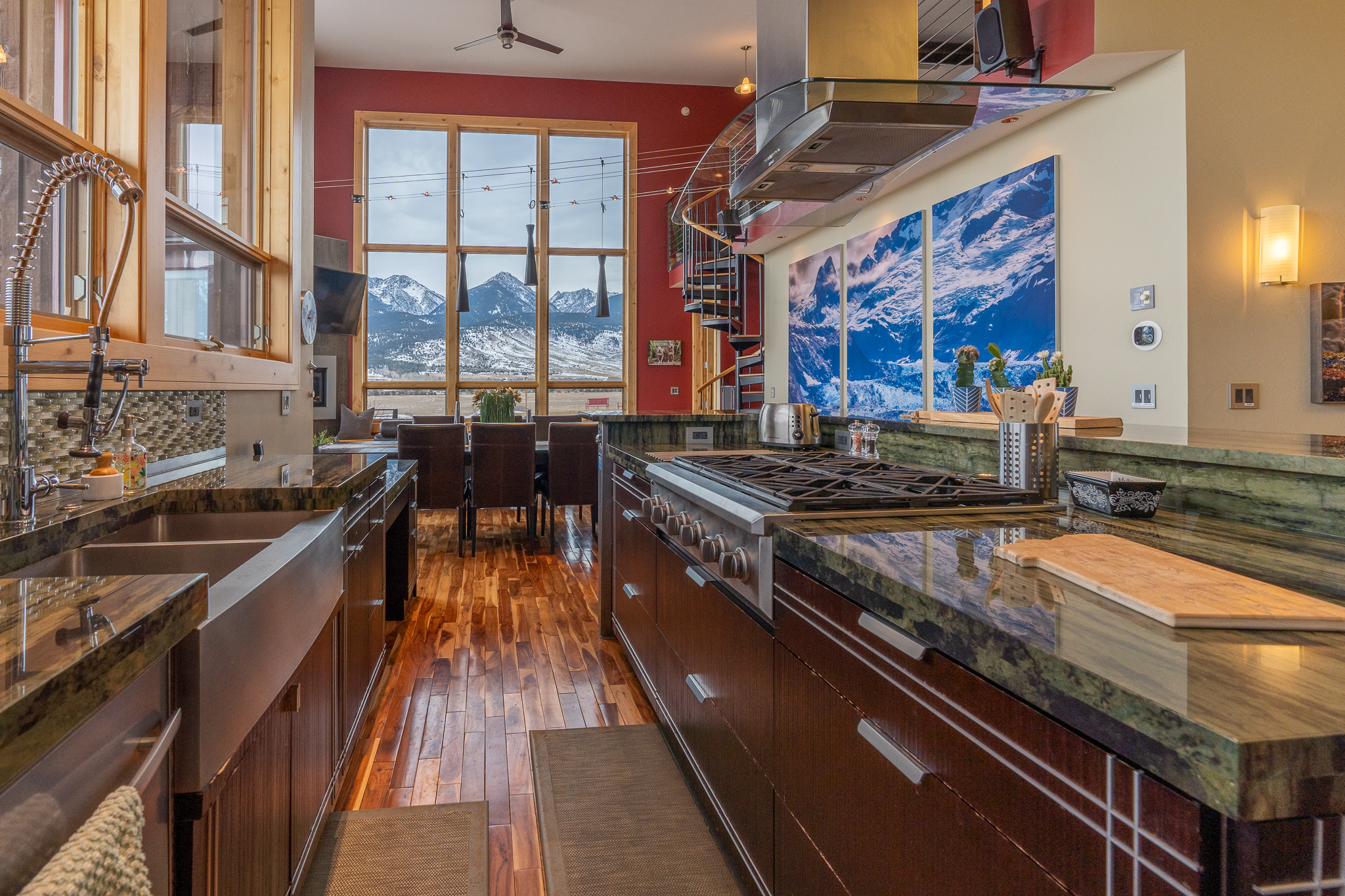 The home was custom built to allow for privacy in all 5 bedroom suites. A bright, open common area and kitchen allow for a luxurious lodge-like feel for gathering, eating, entertaining and soaking in the floor to ceiling views of the most beautiful mountain range on the planet (our opinion of course).